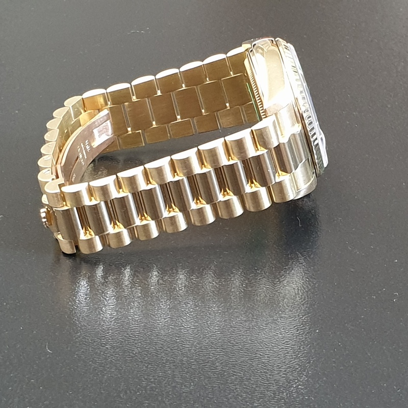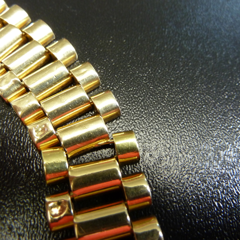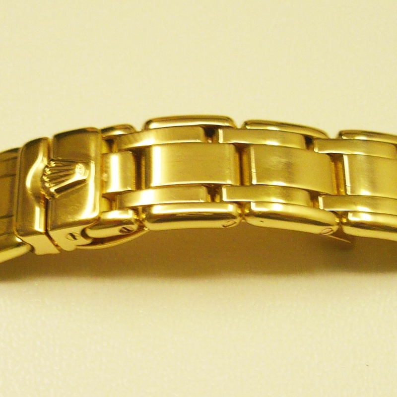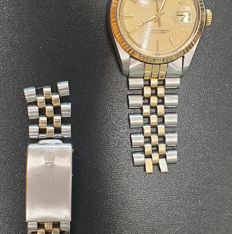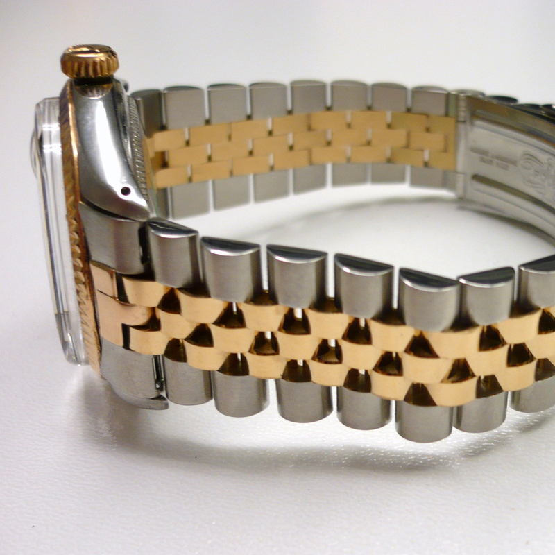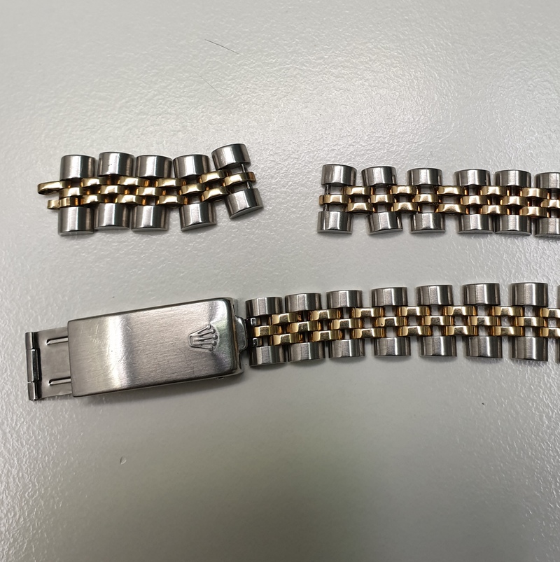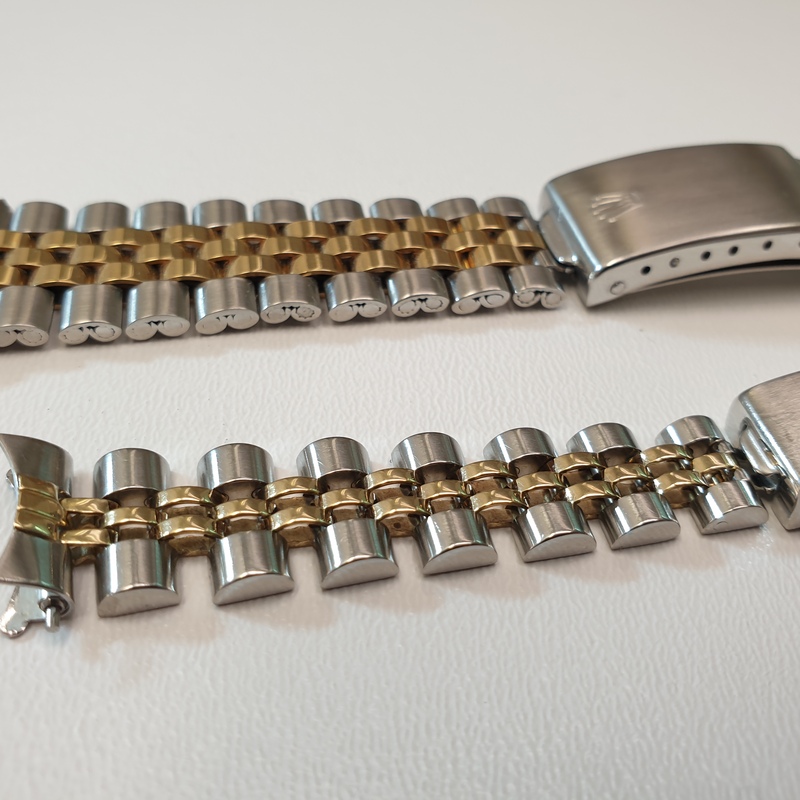 Das Rolex Jubilée-Armband ist ein fünfreihiges Armband, entwickelt im Jahr 1945. An den Außenkanten befindet sich jeweils ein flaches, breiteres Bauteil. In der Mitte verfügen die Rolex Jubilée-Bänder über drei schmalere, abgerundete Profile. Es gilt als das feinere und elegantere Armband. Es wirkt sanft, weich und schmiegt sich gut an ein Handgelenk an, was für besonders angenehmen Tragekomfort sorgt. An der Rolex Date Just als Gold-Stahl-Version (Bicolor) ist das Jubilée-Armband sehr häufig zu finden. Bei einer Rolex Armband Restaurierung müssen fast immer die mittleren Elemente aufgearbeitet werden. Dabei werden oft auch die inneren Stahlstifte aufgelasert.